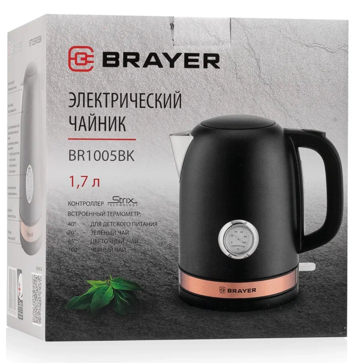 Чайник эл. BRAYER BR1005BK 1.7л., 2200Вт, сталь окраш., STRIX, термометр, черный
