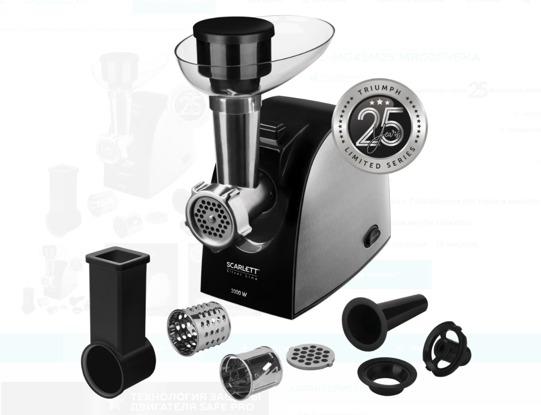 Мясорубка эл. Scarlett "Silver Line" SC-MG45M25, 2500Вт, реверс, 2,5кг в мин., насадки д/колбас, шинковки