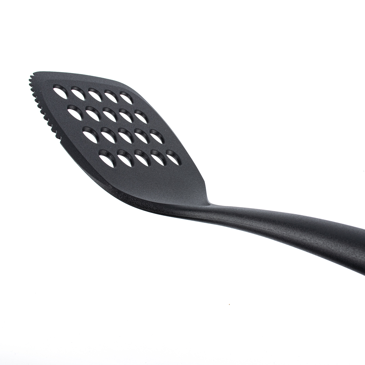 Особенность лопатки — волнистая сторона, которая помогает легко захватывать и переворачивать продукты, а перфорация позволяет избавляться от лишнего жира и жидкости при готовке. Благодаря отверстию для подвешивания хранить лопатку удобно и компактно.