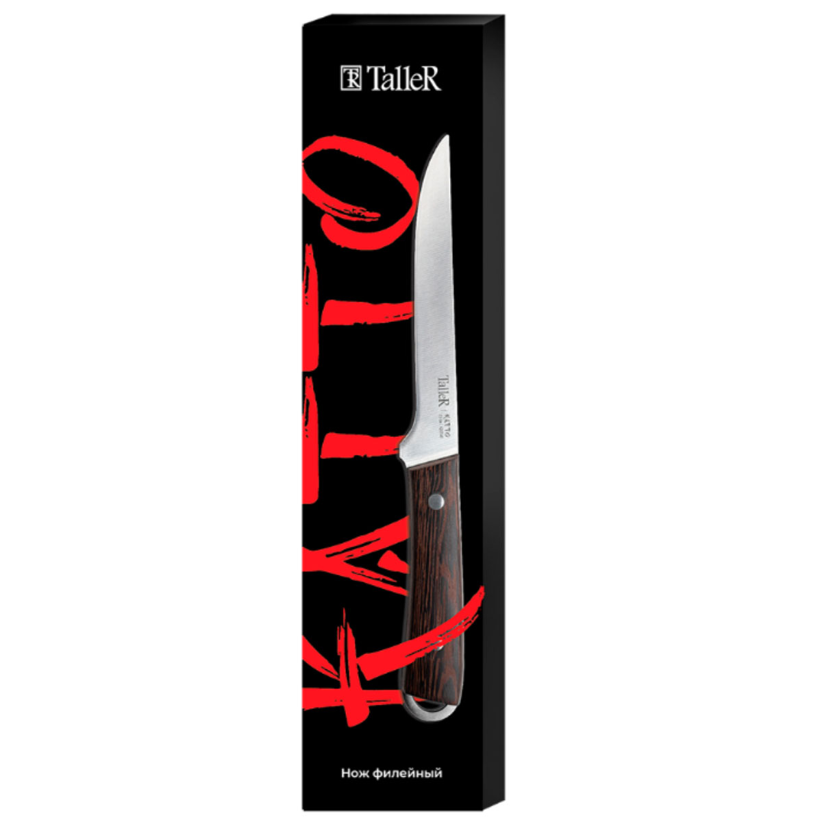 Нож филейный TalleR TR-22055 из серии Катто — это надежный помощник на кухне, созданный для аккуратной и точной разделки мяса и рыбы. Лезвие длиной 15 см изготовлено из прочной нержавеющей стали AISI 420S45, обеспечивающей остроту, износостойкость и долгий срок службы. Толщина полотна — 2,3 мм — делает нож гибким, но прочным, что особенно важно при филировании.