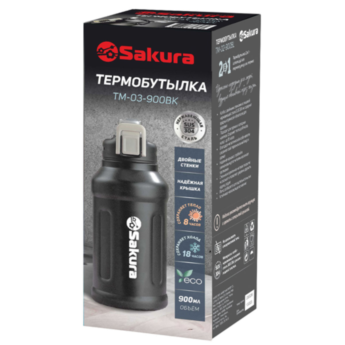 -Термобутылка 0,9л TM-03-900BK 2в1 с трубочкой, черный