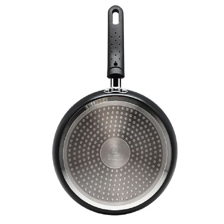Толстое дно толщиной 3 мм гарантирует быстрый и равномерный нагрев, предотвращая деформацию во время использования. Диаметр дна — 20,6 см, что делает блинницу универсальной для большинства плит, включая индукционные. Надёжная бакелитовая ручка на клёпках не нагревается, обеспечивая комфорт и безопасность.