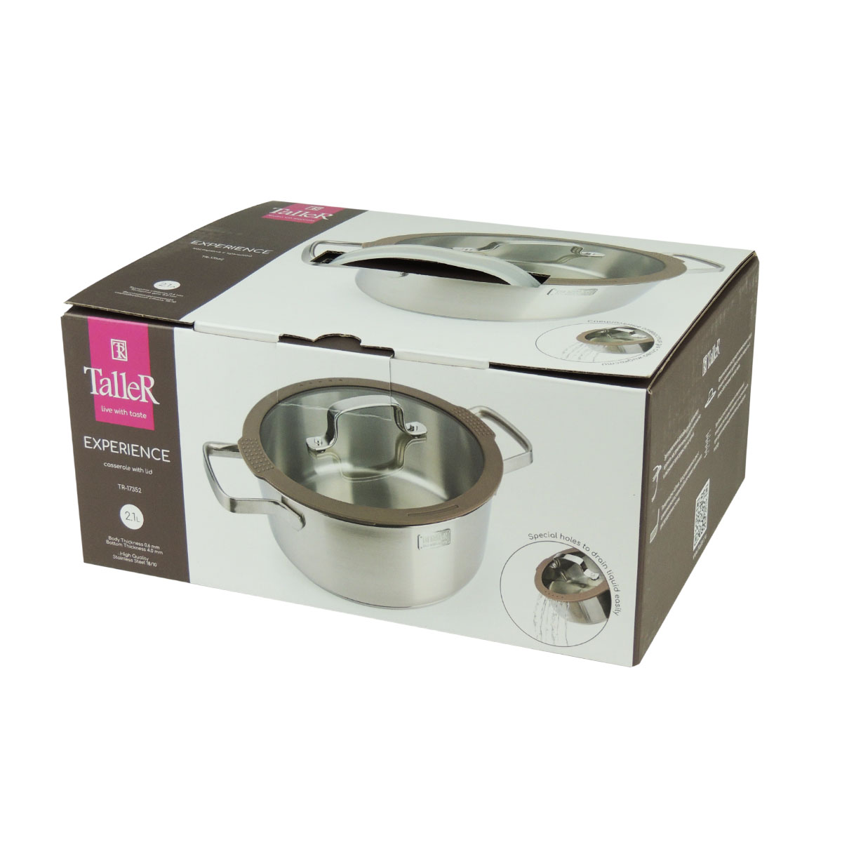 Кастрюля с крышкой TalleR TR-17352 "Экспириенс» объемом 2,1 л — функциональный и надежный выбор для комфортного приготовления. Изготовлена из высококачественной нержавеющей стали 18/10 с капсулированным дном толщиной 4 мм, что обеспечивает равномерное и быстрое распределение тепла. Стенки толщиной 0,6 мм гарантируют долговечность и прочность. Внутренняя и внешняя поверхности кастрюли имеют матовую полировку, которая устойчива к царапинам и легко очищается.