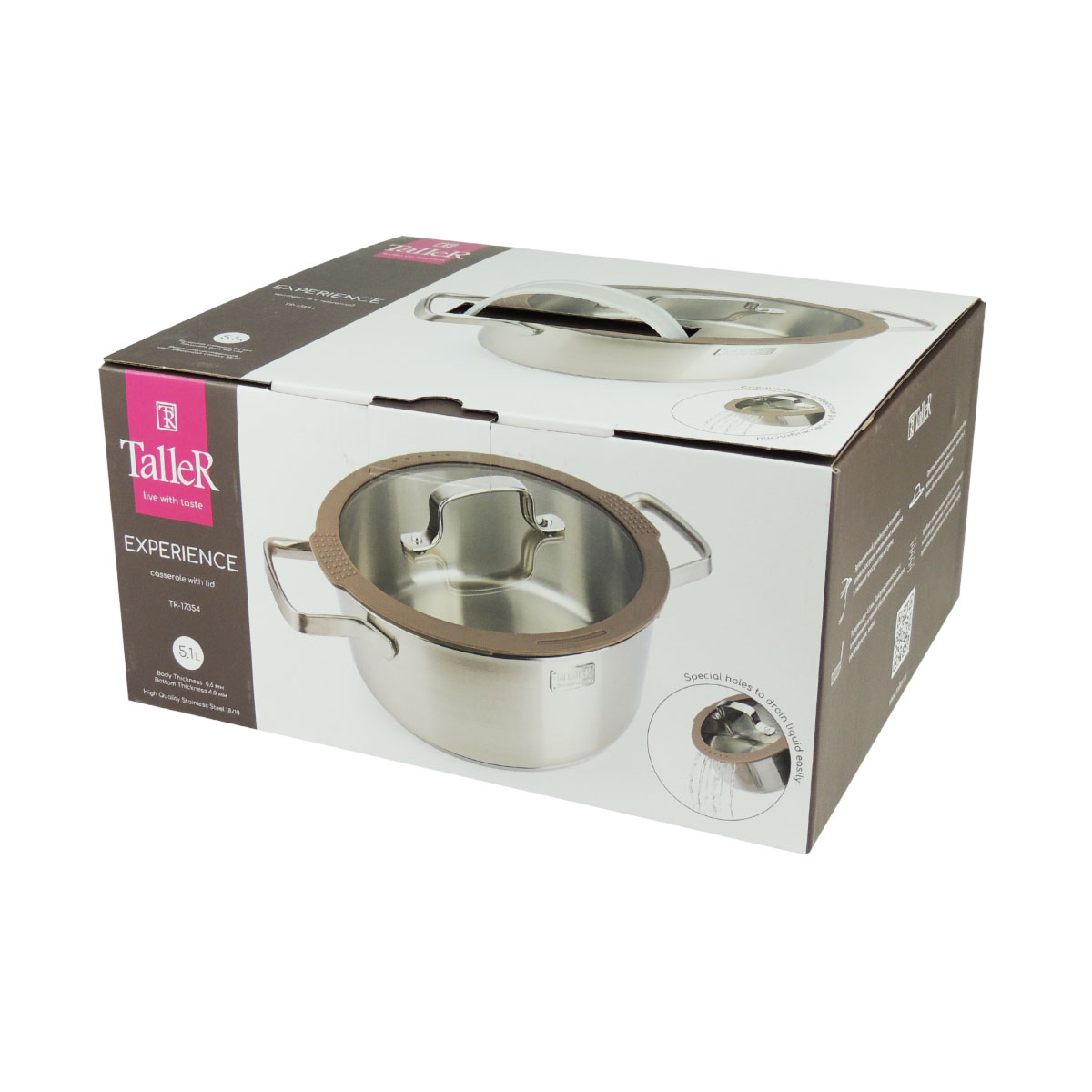 Особенность модели — комбинированная крышка из закаленного стекла с оригинальным силиконовым ободом светло-коричневого цвета. Такая конструкция позволяет удобно сливать жидкость через отверстия, обеспечивает выход пара и бесшумное закрывание кастрюли. Силиконовый обод защищает посуду от сколов и царапин. Ручки выполнены из нержавеющей стали и закреплены точечной сваркой для максимочной прочности. Внутри кастрюли есть удобные отметки литража.