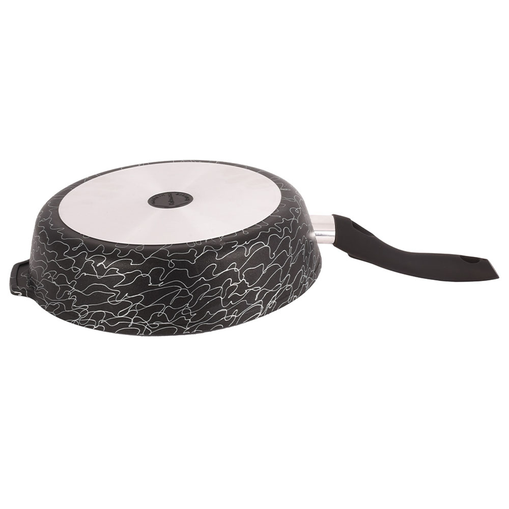 Чёрный цвет корпуса с элегантным серебристым декором добавляет стилю кухонного интерьера, а удобная несъёмная ручка обеспечивает надёжный хват. Сковорода совместима с газовыми, электрическими и стеклокерамическими плитами.